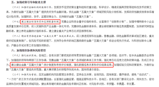 在强化组织实施方面,《意见》提出,建立健全金融“五篇大文章”统计制度和考核评价制度,强化数据信息共享和评价结果运用。