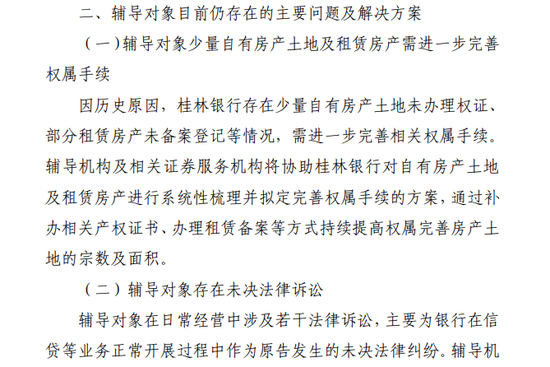 4月21日,中信证券发布关于桂林银行股份有限公司首次公开发行股票并上市辅导工作进展报告(第七期)。辅导报告显示,因历史原因,桂林银行存在少量自有房产土地未办理权证、部分租赁房产未备案登记等情况。同时,在该行日常经营中涉及若干法律诉讼尚未解决。