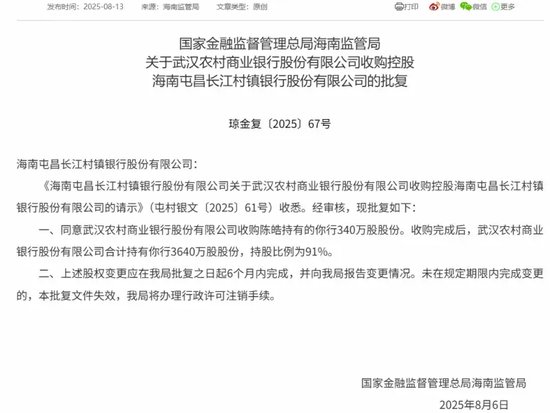 8月13日,国家金融监督管理总局海南监管局发布批复,同意武汉农村商业银行股份有限公司(以下简称“武汉农商行”)收购并控股海南屯昌长江村镇银行。
