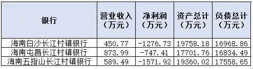 从2024年审计报告数据来看,这三家银行均深陷亏损泥潭,其中五指山长江村镇银行亏损最为严重(-1571.92万元),白沙、屯昌长江村镇银行分别亏损1276.73万元和747.41万元。三银行合计亏损近3600万元,营收规模则均未突破1000万元。