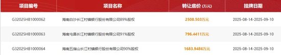 8月14日,武汉光谷联合产权交易所信息显示,武汉农商行在该所挂牌转让该行持有的海南白沙长江村镇银行89%股权、海南屯昌长江村镇银行91%股权和海南五指山长江村镇银行90%股权,挂牌价分别约为2508.50万元、796.44万元和1683.95万元。