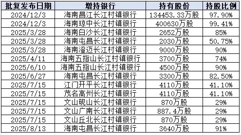 此外,海南“长江系”六家村镇银行是此轮增持的重点,持股比例已普遍提升至80%以上。天眼查信息显示,这批成立于2014至2015年间的金融机构,注册资本在3120万元至1亿元不等,均为武汉农商行早期在海南发起设立的县域金融服务支点。