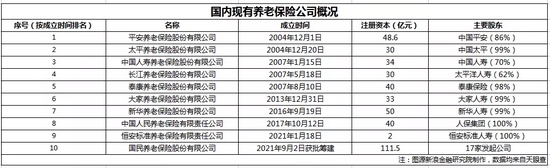 自2004年12月,平安养老保险成立以来,目前国内共有9家养老保险公司,其分别为平安养老、太平养老、国寿养老、长江养老、泰康养老、大家养老、新华养老、人保养老和恒安标准养老。