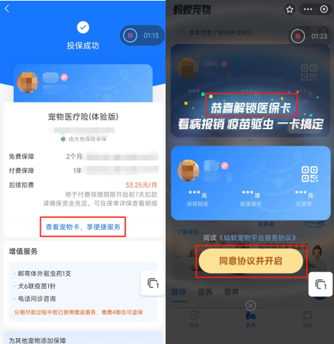 随后,页面跳转,出现“恭喜解锁医保卡”等字眼,页面下方有一行 “同意协议并开启”的按钮。整个页面完全没有出现扣费说明,《蚂蚁宠物平台服务协议》里也没有明确提及9.9元的费用。就这样,一些投保人选择“同意协议并开启”,稀里糊涂就开通了自动续费的“宠物医保”。