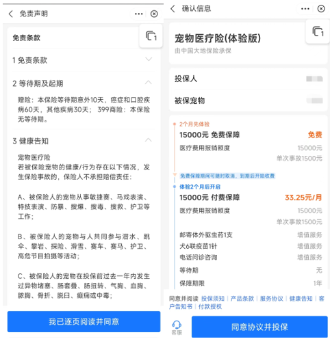 填写被保宠物信息,点击“领取并投保”,页面跳转到“免责声明”,点击“我已逐页阅读并同意”,随后即可确认信息,选择“同意协议并投保”,即成功投保。