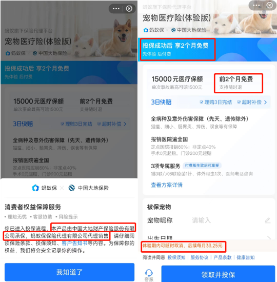 投保过程中,新浪金融曝光台阅读合同细则得知,宠物医疗险(体验版)包含两个保险产品(2个月保险期间的宠物医疗赠送险和12个月保险期间的宠物医疗商业保险)。其中,赠险属于赠送福利,消费者在购买并支持399商险缴费授权后,方可领取并享受赠险服务。另外,保险公司将于赠险服务结束7日内,从投保人的支付宝账户扣除399商险的保费。