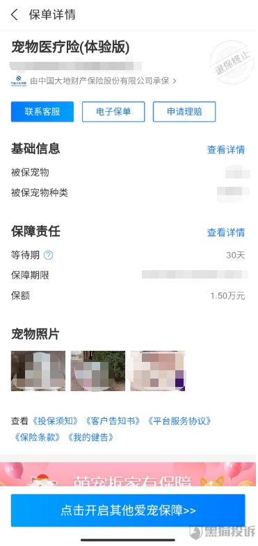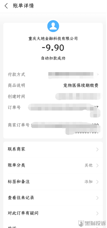 “私自给我开通宠物医保,并在没经过我同意情况下私自开通自动扣费,在自动扣费之前也没有任何短信提示。”怀疑自己受到欺诈后,该名投诉者在黑猫投诉平台对大地保险发起投诉,要求退还9.9元保费。