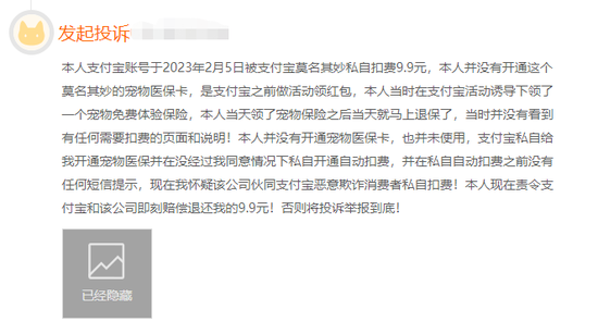 一位投诉者在黑猫投诉平台称被支付宝私自扣费9.9元。据其回忆,他曾在支付宝红包活动诱导下,领取了宠物免费体验保险(宠物医疗险体验版),但领取当天就退保了,当时并没有看到有任何扣费的相关说明。该名投诉者还强调,自己并没有开通宠物医保卡,也并未使用。