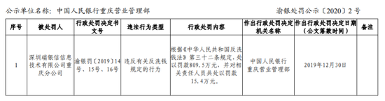 1月10日,央行重庆营业管理部公布行政处罚信息显示,瑞银信重庆分公司因存在违反有关反洗钱规定的行为,被处以809.5万元罚款,并对相关责任人员共处以15.4万元罚款,处罚决定日期为12月30日。