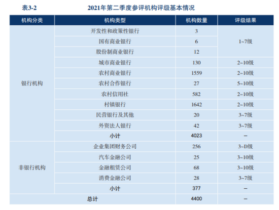 具体来看,4400家参评机构包含大型银行24家、中小银行3999家、非银行机构377家。评级结果划分为11级,分别为1~10级和D级,等级越高表示机构的风险越大,已倒闭、被接管或撤销的机构为D级。