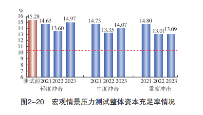 宏观情景压力测试结果显示,30家大中型银行整体资本充足水平较高,总体运行稳健。轻度、中度、重度情景下,30家大中型银行整体资本充足率均高于10.5%的监管要求,表明30家大中型银行整体对宏观经济冲击具有较强的抵御能力。