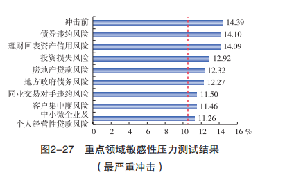 在敏感性压力测试中,中小银行对整体信贷资产质量恶化的抵御能力较弱。