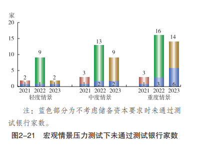 不过,30家大中型银行个体风险抵御能力有所差异。在轻度、中度、重度情景下,2022年末分别有9家、13家、16家银行未通过测试, 经由利润留存补充资本,2023年末未通过测试银行家数将分别降至2家、9家、14家。若不考虑2.5%的储备资本要求,在轻度、中度、重度情景下,2022年末未通过测试的银行家数将分别降至1家、2家、3家。