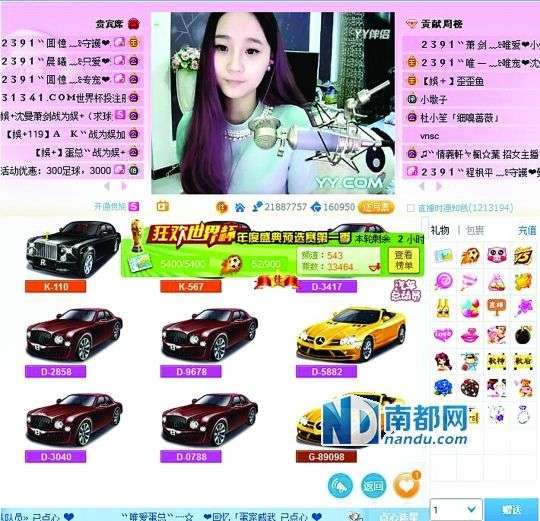 十分钟后,高潮出现了。一名贵族开始用“一生一世”示好。应景世界杯,他一下送出了88组1314的球迷票。随后,他又开始成组送月票,一次520张,每张2.5元。最初的月票用于会员抽奖,抽到后可以送给喜欢的主播增加人气。后来,Y Y主播人气的高低开始完全取决于金钱的多少:月票开始出售了,并且很快地,只能一张张刷变为了可以一组组刷。