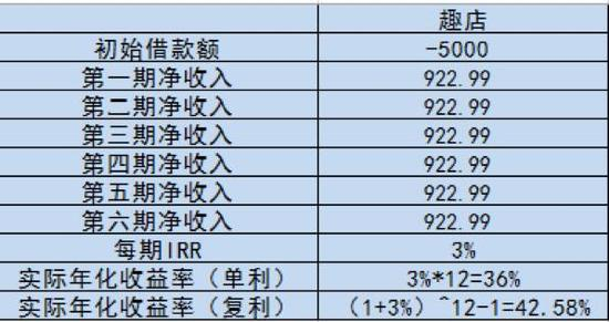 表格为趣店的现金流情况,计算出每月IRR为3%,即趣店的盈亏平衡点。在这6个月中,如果有一期利率低于3%,即某一期借款方没有按时还922.99元,此后也不还钱或者直接卸载APP赖账,那么趣店这笔贷款就是亏损。对应转化成实际年利率,在单利情况下为3%*12=36%,复利条件下为(1+3%)^12-1=42.58%。