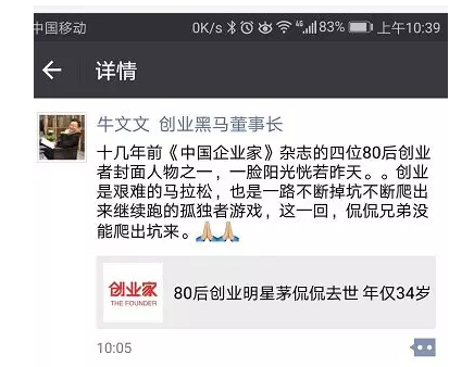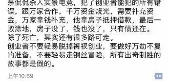 “正如牛文文所言,创业就是一个又一个的难关,压力太多、困难重重,个人疏导太重要,茅侃侃走真的挺可惜的。”一位创业者这样感叹道。