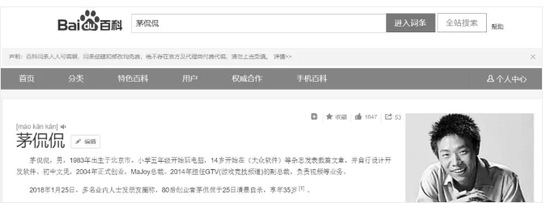 茅侃侃的百度百科词条,已是黑白颜色。