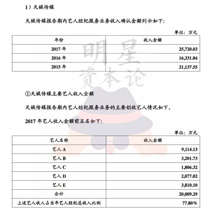 来,大家来猜一猜下图里给天娱贡献艺人收入的,非实名制的ABCDE都是哪些艺人: