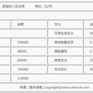 根据王先生家现阶段的财务状况,嘉丰瑞德理财师为成先生家简单制作了家庭收支统计表,如下: