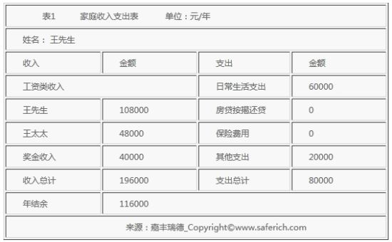 王先生今年32岁,家在福州,目前在国内是一名业务营销人员,每月净收入9000元,年底奖金40000元。太太每月净收入4000元,目前已有4个月身孕。夫妇俩的公司都有基础社保。家庭每月生活开支5000元,其他年开支10000元。活期存款70万元,自住房产100万元,没有任何家庭负债,也无房贷,整体家庭年收入近20万,无投资大型项目,家庭前期大型资金收入来源基本都是家人在国外务工所获。