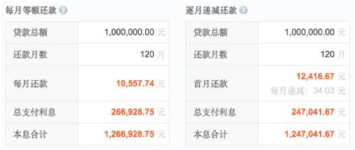 100万贷款10年的话,网上找个房贷计算器,成本是这样的: