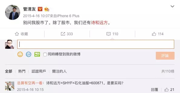 15年4月16日,民生证券研究所管清友发了个微博“别问我股市了。除了股市,我们还有诗和远方”