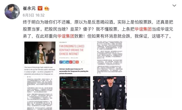 其实不只是股民,名人也免不了犯错,小崔喷华谊兄弟,但是把名字弄错了,喷了华谊集团,喷完之后才知道这是个化工企业,和华谊兄弟是一点关系都没有,可是他一喷华谊集团就跌了4.85%。
