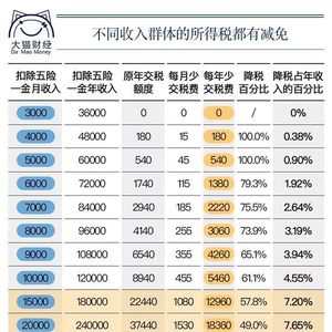 起征点是不是该更高些?税率是不是该再调整下?这些建议大家都可以继续提,但眼下按规定好的来,再修订也是几年后的事情了。整体来说,对不同收入群体的所得税都有减免,这个图比较的清晰: