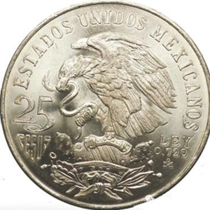 另一枚耗银最多的纪念币就是产银大国墨西哥出品的,约发行了2700万枚,据估算,制造这枚纪念币就耗费掉了近440.3吨纯银。1968年,墨西哥城举办了第19届奥运会。这枚银币面值25比索,币径38mm,重量22.5g,含银量72%。此币正面图案有国名、带有浓郁墨西哥风情的栖息于仙人掌上的鹰蛇、面值、造币厂印记“M”;背面图案为墨西哥土著玛雅人球赛,背景是工字形赛场。
