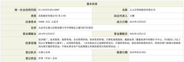 借贷宝由人人行科技股份有限公司运营。据全国企业工商注册信息查询系统信息显示,人人行科技成立于2014年12月22日,法定代表人为王璐,注册资本是5.5亿人民币。
