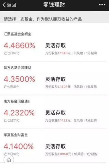 微信现在对接的这四只货币基金规模一般。截至2017年6月,易方达易理财规模为606亿、华夏财富宝A规模为211亿元、汇添富全额宝规模为205亿元,南方现金通E规模为161亿元,四只产品合计规模为1183亿元。