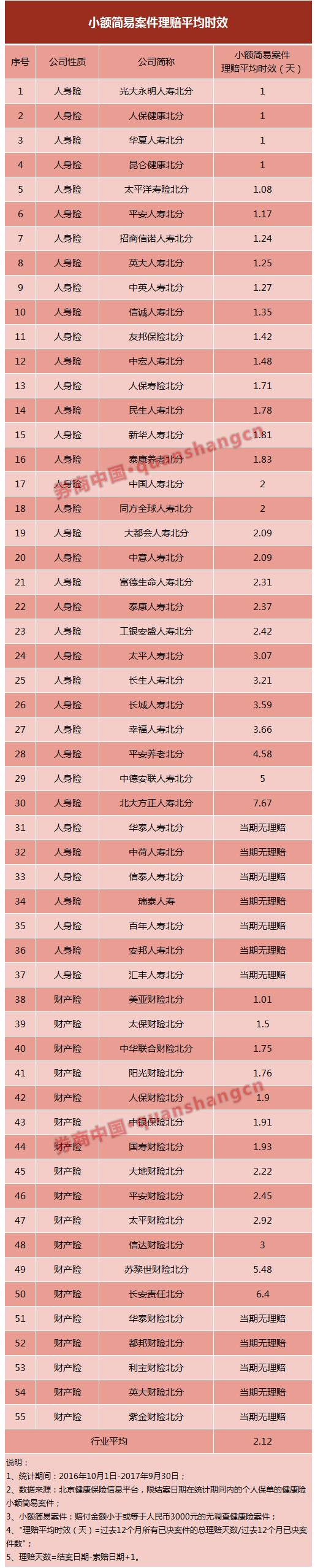 纳入统计的55家保险公司北京分公司中,除有12家当期无理赔外,其余险企整体的小额简易案件理赔平均时间为2.12天。