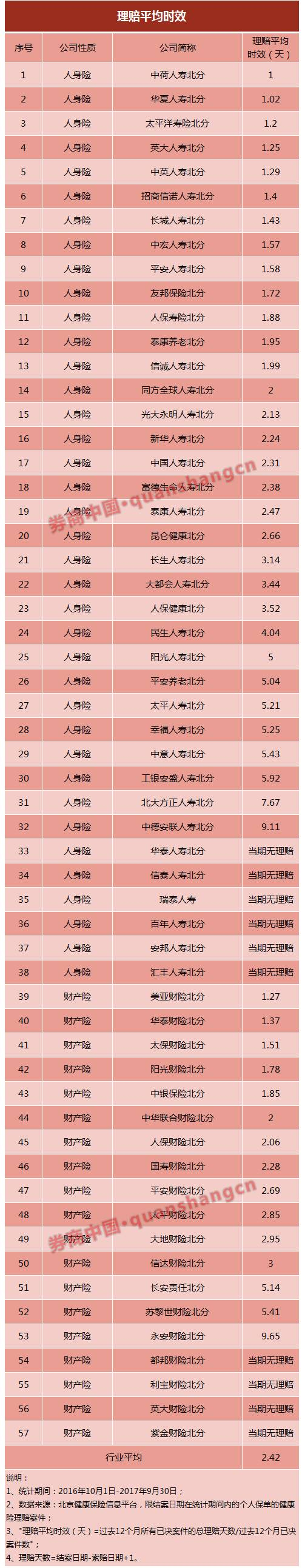 57家保险公司的北京分公司中,在统计期间有理赔的是47家,平均理赔时间是2.42天。