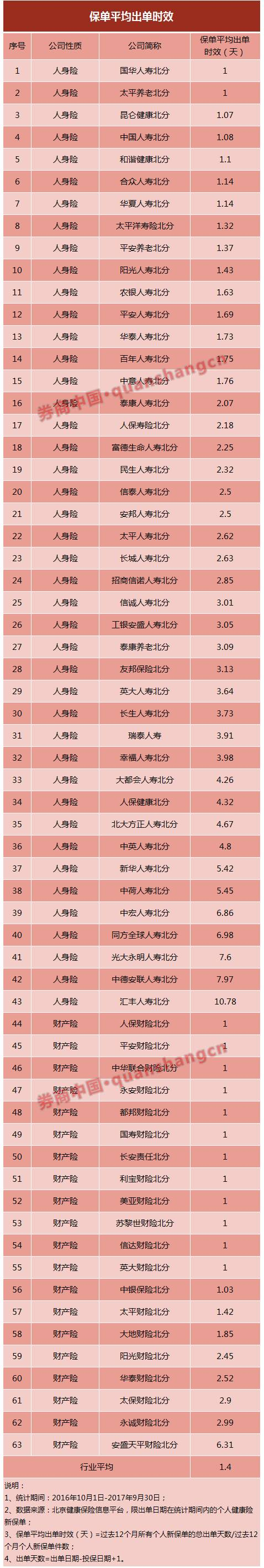 北京地区63家保险公司有“保单平均出单时效”数据,包括43家寿险公司和20家财险公司,其平均出单时间为1.4天。