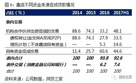 2017年上半年,趣店与消费金融公司和银行合作的助贷业务(表外交易,计提或有负债)交易额为为28.15亿元,占整个平台交易额的7.4%;通过在金交所网金社发行ABS促成的交易占比为在33.5%以上;信托资金的交易占比在14.6%;其通过自有资金(网络小贷+信托通道)促成的贷款比重为44.6%。其中,由旗下两家网络小贷抚州小贷(10亿注册资本)和赣州小贷(注册资本9亿)促成的交易额为83.3亿元,占总交易额的23.1%。