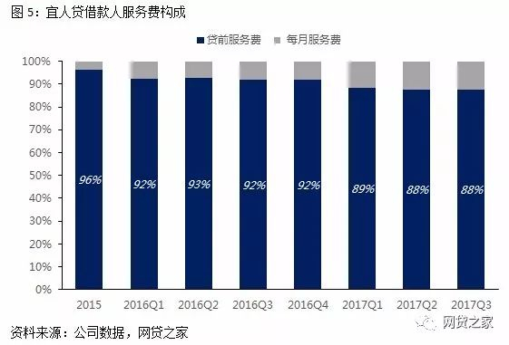 在宜人贷向借款人收取的服务费中,目前贷前服务费收入占比达到88%,是平台当期的主要收入。对于平台而言贷前服务费一旦取消,收入将在短期之内出现剧减。如果平台将所有收入递延且分摊在未来的每期还款当中,虽然整个贷款生命周期中收取的服务费总额不变,但期初促成贷款的成本将无法被覆盖(现金激励、销售费用、宜信普惠的中介费等),且要面对借款人违约之后没有收入的窘境。