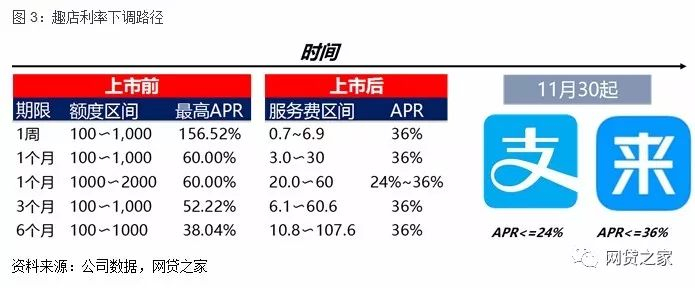 趣店:利率符合监管规定,但连续两次的利率下调对其未来业绩将有一定负面影响。趣店在上市前将现金贷业务以及消费分期业务的服务费率下调,降低借款人APR至36%以符合民间借贷利率上限。11月30日起,趣店通过支付宝消费界面完成的所有贷款利率被下调至24%以下以满足蚂蚁金服的要求。