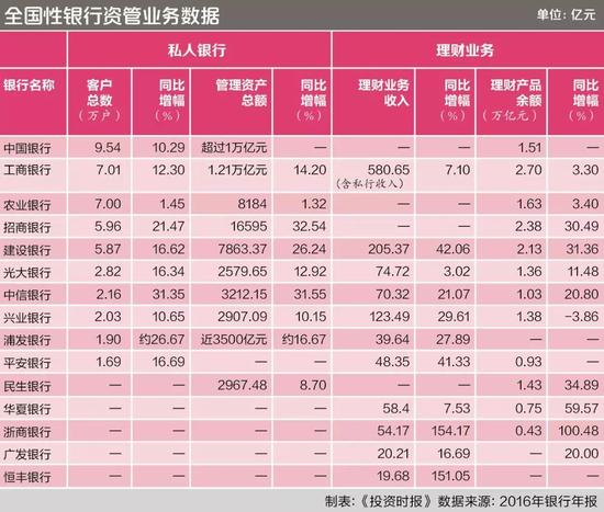 在管理的资产规模方面,至2016年底,居首的是招商银行,管理的私人银行客户总资产为1.66万亿元。超过万亿元的还有工商银行和中国银行,农业银行、建设银行也均在7000亿元以上。而浦发银行、中信银行、民生银行、兴业银行和光大银行则均在2500亿-3500亿元之间。