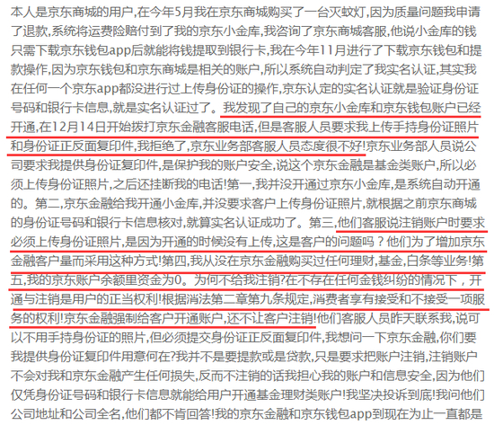 投诉内容显示,客户在不知其京东小金库和京东钱包账户已经开通的情况下,同样在执行退款提现程序时,客服人员要求上传手持身份证照片和身份证正反面复印件且态度很不好。并且京东金融为该客户开通小金库时并没要求上传身份证照片,但注销账户时要求必须上传身份证照片。客户称其从没在京东金融购买过理财、基金、白条等,且京东账户余额里资金为0的情况下,京东不给客户账户注销,只是为了增加京东金融下载量。