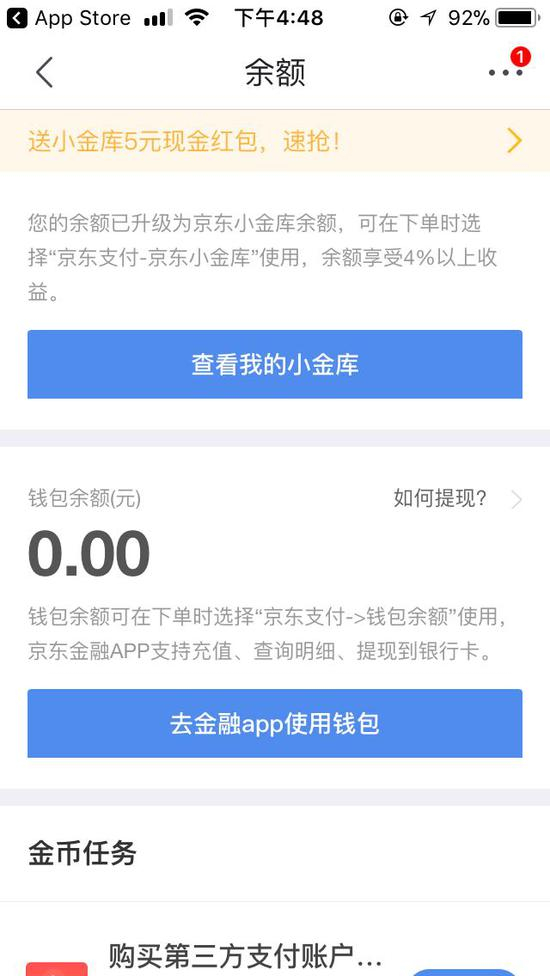 金小鲸打开京东商城APP,目前京东商城中的余额已经“升级”为小金库余额,若要进一步查看等操作,又进入了前述诱导下载京东金融APP的界面。