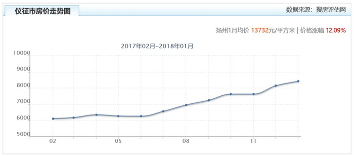 搜房评估网数据显示,2017年2月,仪征市二手房均价在6000元/平方米左右;到2018年1月,仪征二手房均价已上涨至8500元/平方米,11个月的涨幅达41.67%。