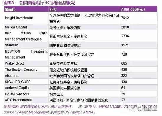 第一,每个资管“精品店”有自己专长的投资领域。例如,固定收益类业务专家Insight Investment、货币市场基金专家BNY MellonCash Management Strategies、全球权益类投资专家WalterScott、次级债券资产管理者Alcentra、房地产投资专家Amherst Capital等。
