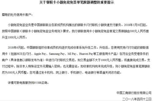 工行牡丹信用卡公告称,自6月起,将小额免密免签的单笔限额由300元调至1000元。