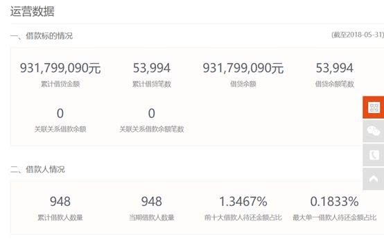根据唐小僧披露数据显示,截至2018年5月31日,唐小僧累计借贷金额达9.32亿元,借贷余额亦为9.32亿元,借贷余额笔数为53994笔。平台当前及累计借款人数量均为948人,其中前十大借款人待还金额占比为1.3467%,最大单一借款人待还金额占比0.1833%。