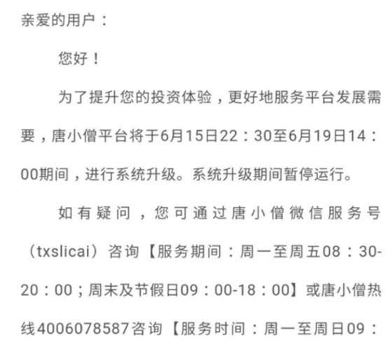 事实上,唐小僧在爆雷前就已有征兆。唐小僧理财APP上一则公告称,平台将于6月15日22:30至6月19日14:00进行系统升级,系统升级期间暂停运营。不少投资人认为,放假期间进行系统升级在业内比较少见,且升级时间过长,非常可疑。