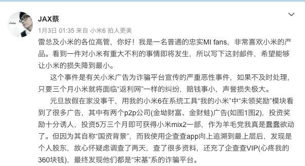 然后,他以资深米粉的身份,在微博上给小米写了封公开信,并私信小米高管,警示P2P理财广告的风险,但这封信并未得到任何官方或者私下的回馈。