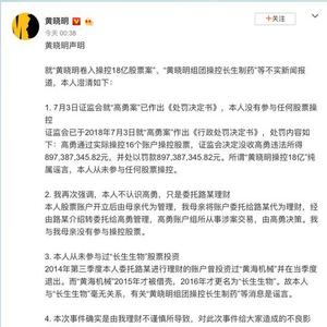 8月15日00:38,黄晓明通过其个人微博再次发布声明称,没有参与任何股票操控;自己并不认识高勇,只是母亲张某把账户委托给了路某代为理财,他自己从未参与“长生生物”的股票投资。并称,此次事件由他理财不慎所致。