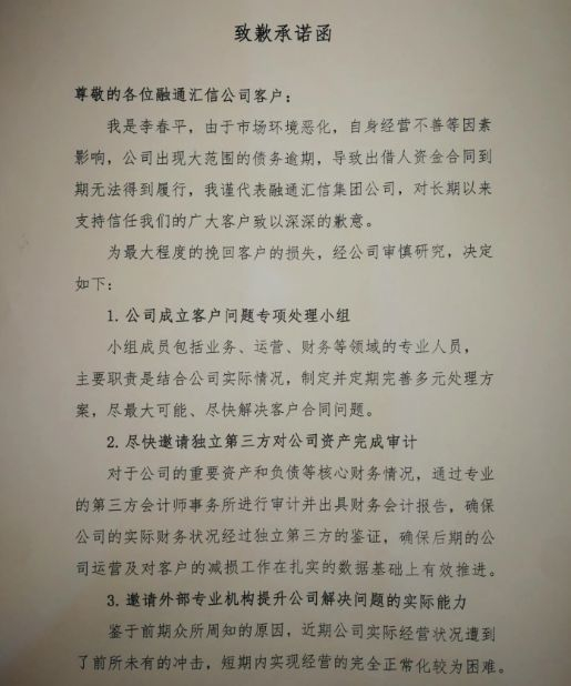 融通汇信董事长李春平在国庆节期间发布了《致歉承诺函》,对之前平台出现大范围逾期提供了四种解决方式,并称将最大程度挽回客户损失。