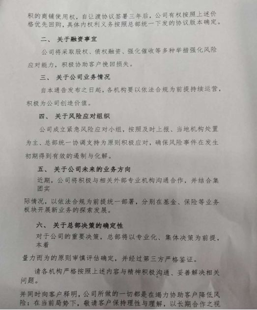 事实上,9月11日,多家媒体曾经报道过融通汇信集团有限公司于9月11日发布“关于应对当前风险及公司转型发展决议的通知”文件,称公司近期出现风险状况,对项目延期兑付计划进行了披露,提出9月30日前到期的客户,争取2018年9月28日前到账50%,12月31日前逐步到账剩余50%。而9月30日后到期客户,均执行“5年分期方案”。