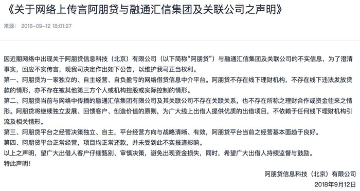 不过,9月12日晚间,阿朋贷官网急忙撇清关系发布声明称,阿朋贷不存在线下理财机构,不存在线下违法发放贷款的情形,亦不存在被其他第三方个人或机构控股或实际控制的情形。阿朋贷当前与网络中传播的融通汇信集团有限公司及其关联公司不存在关联关系,也不存在所称之理财合作或资金往来之情形。